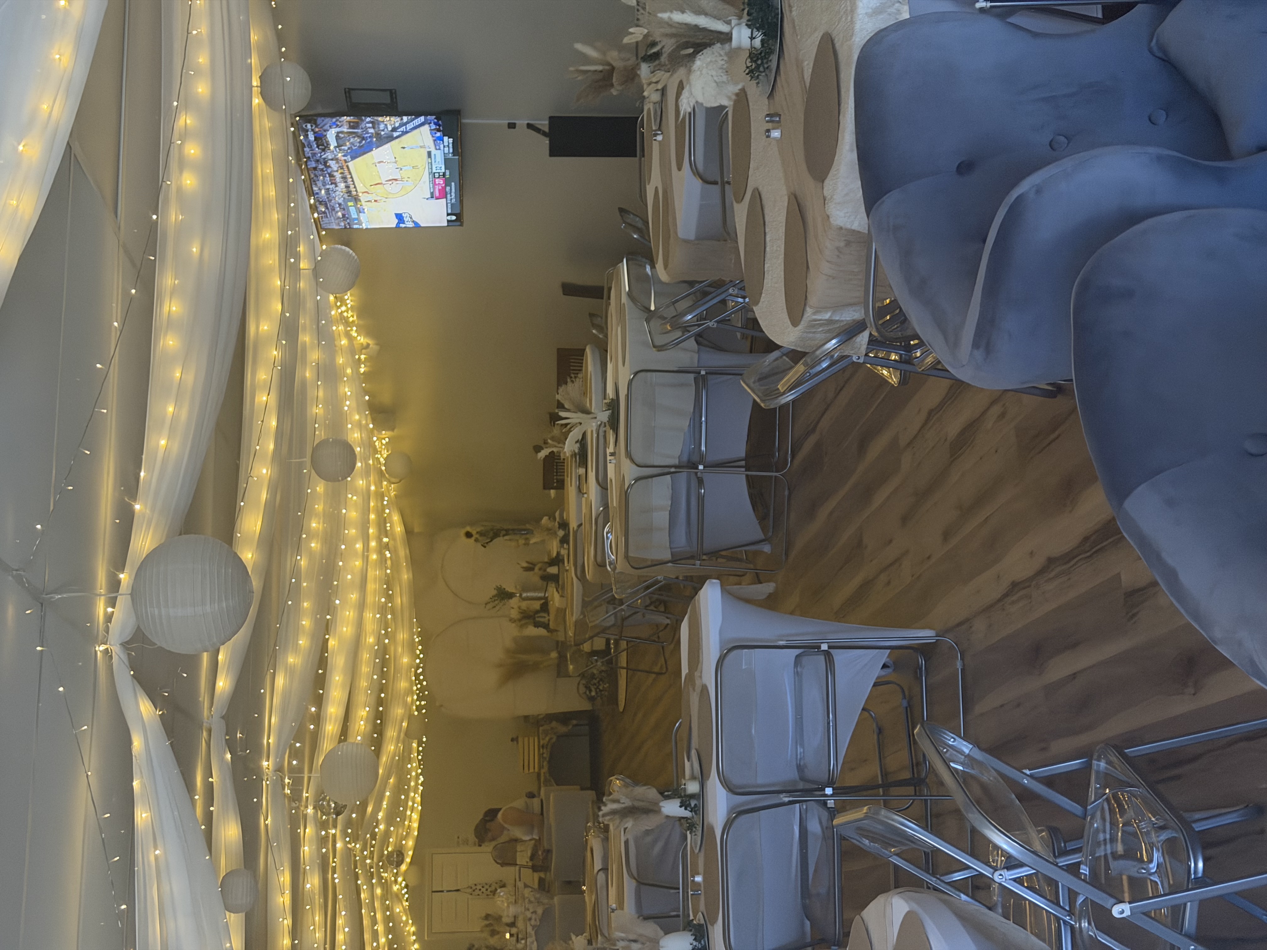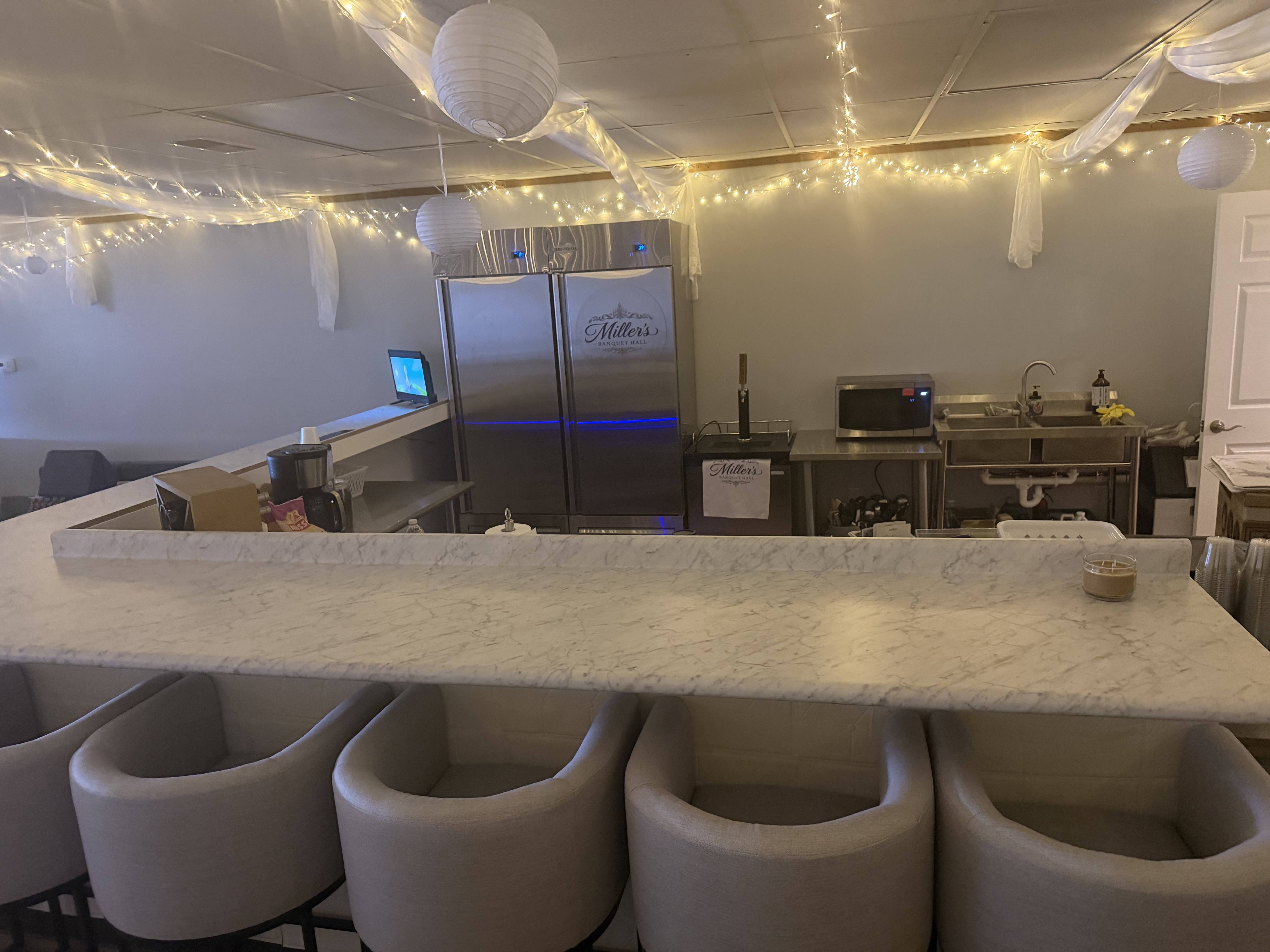 Miller’s Banquet Hall is the ultimate destination for any event. The banquet hall has a place for everyone no matter if you are a baby or an adult. Bring the kids to play in the indoor play area, the babies to roll around the padded baby room, the teens to lounge in the teen area and play the Xbox, or the adults to sit at the bar or in the banquet area to enjoy food and conversation. Book for birthday’s, engagement celebrations, showers, meetings, heartwarming reunions, graduations, celebrations of life, or for any reason you would like to have an event. We have an open venue policy and an array of furniture and decor which is all included for one daily rental price of $400 or a half day 4 hour rental for $200. Miller’s Catering Hall is the perfect unique space for your event. Experience high-impact visual elegance with the convenience of seamless online booking and payments. Make the space your own by decorating with our decorations or you can bring your own. We had 15 round tables that seat 8 at each table, 4 6foot rectangle tables, 3 standing tables, and two kids tables with 12 chairs. We offer 120 clear chairs, 6 bar stools, a couch and 6 comfortable sofa chairs. Each table has a white spandex tablecloth. We even offer table runners and charter plates. If you want a fancy party we have 120 sets of dishes including dinner plates, salad plates, bowls, cups, and Champaign glasses. If you want to use the space for a kids party you can move the picket fence to open up the space for more play. The space is designed for you to make it your own no matter what occasion you are having.
